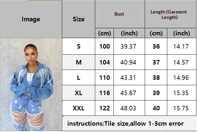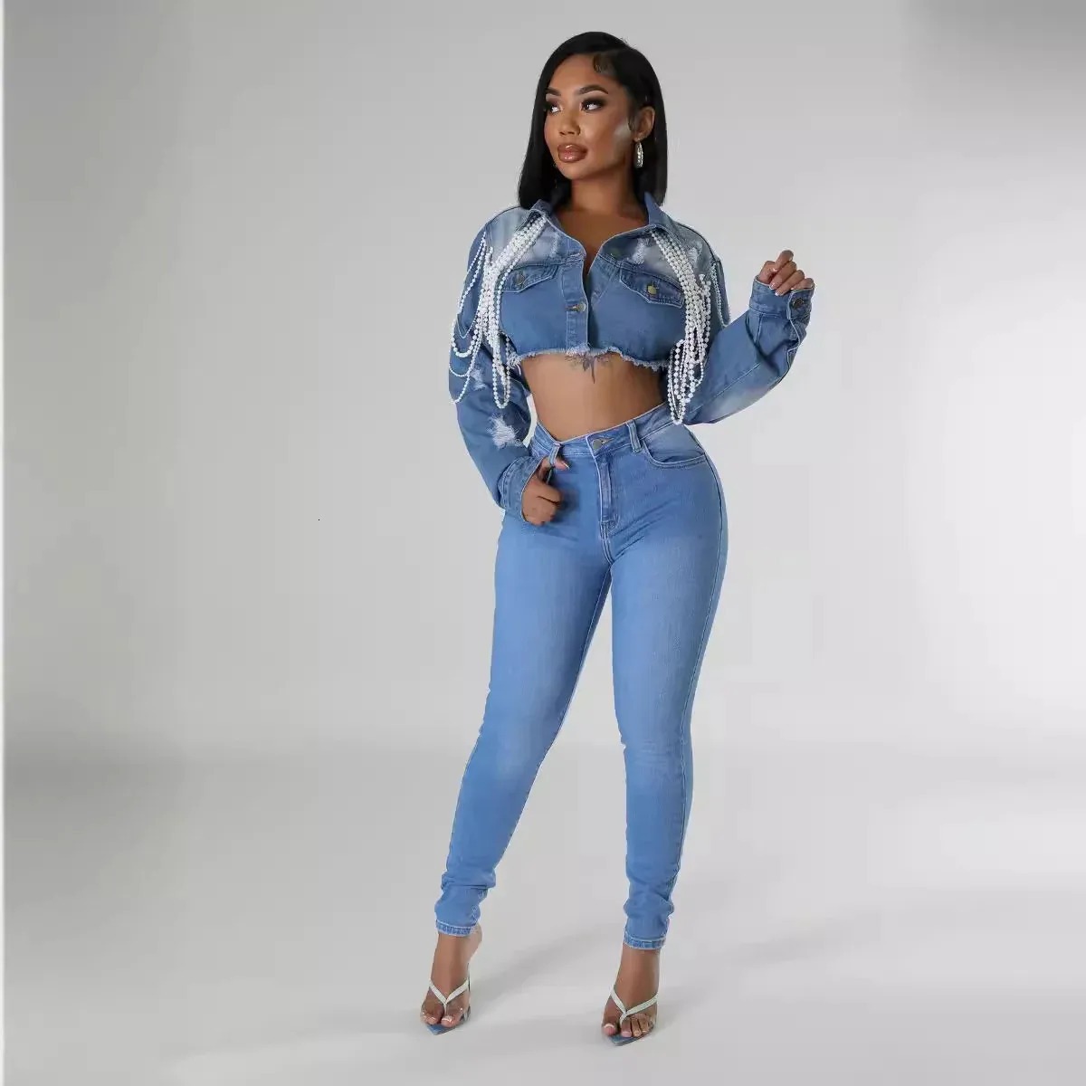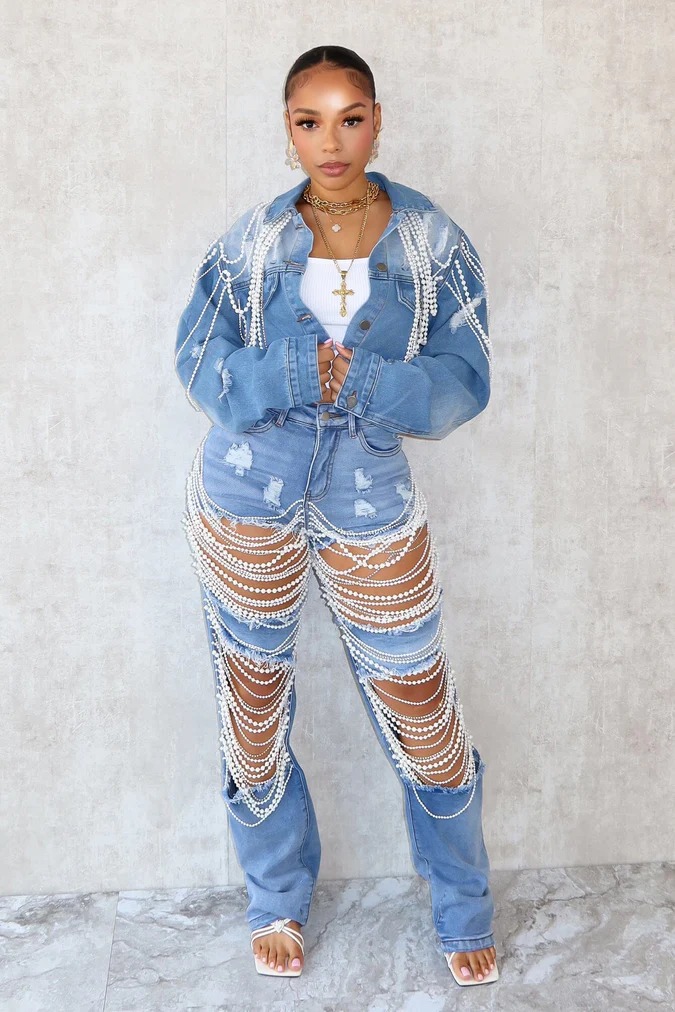 Fashionable Pearl-Chain Hand-Embroidered Beaded Denim Jacket