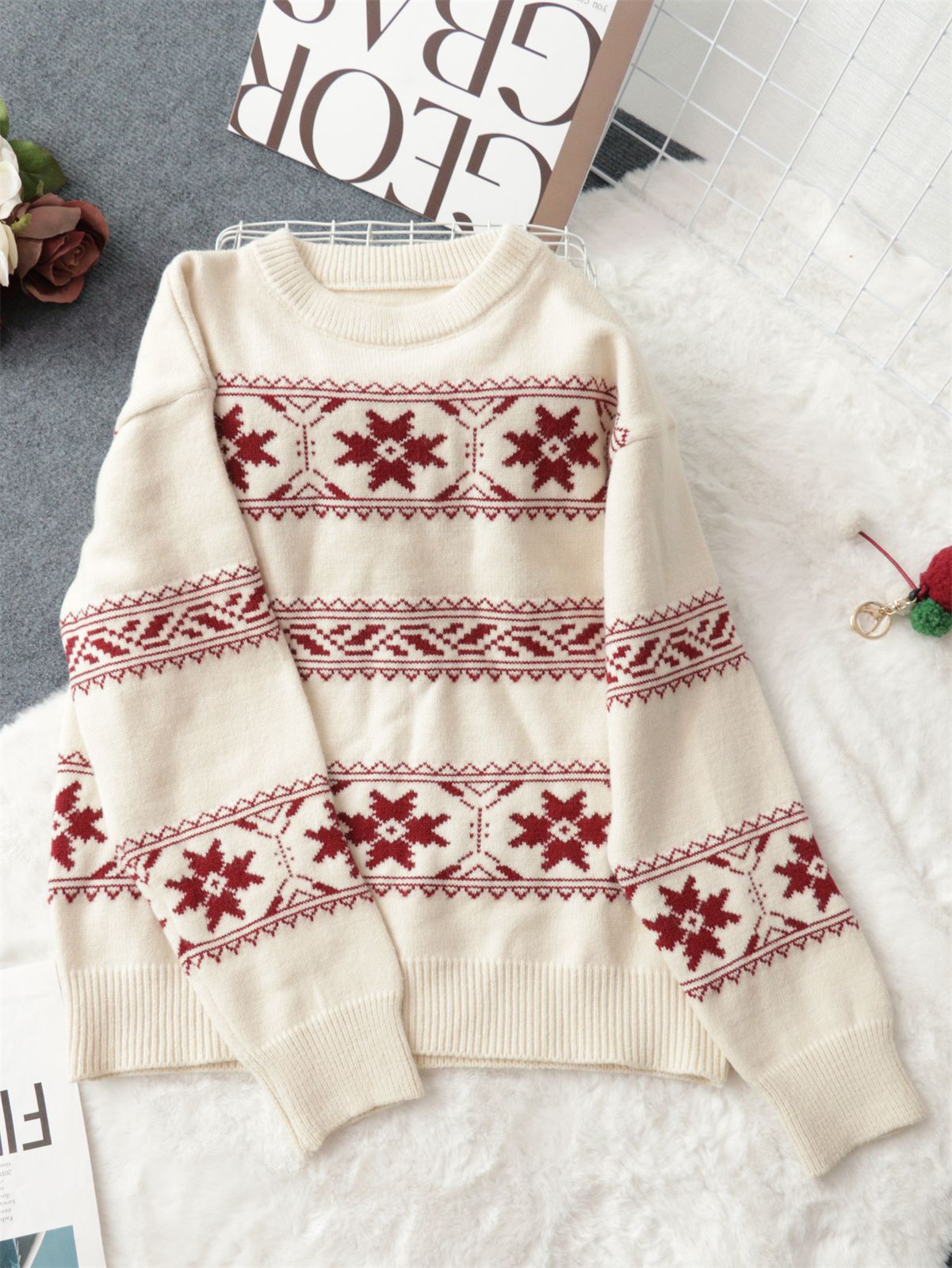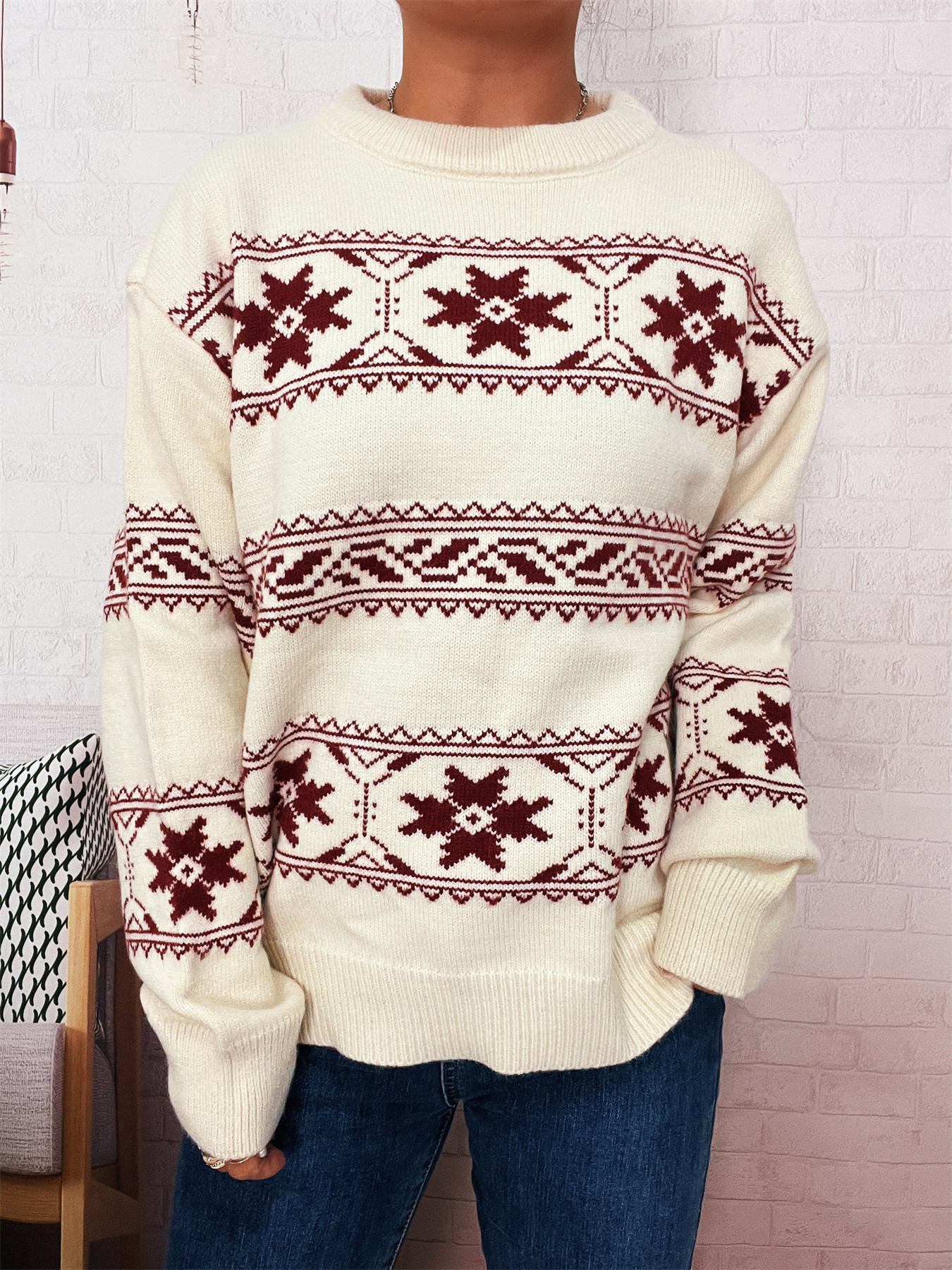 Holiday Christmas Sweater With Snowflake Jacquard Contrasting Colors And Crew Neck