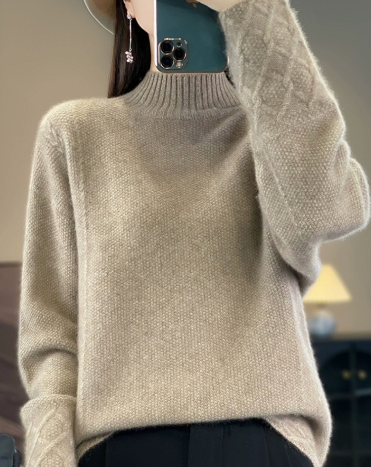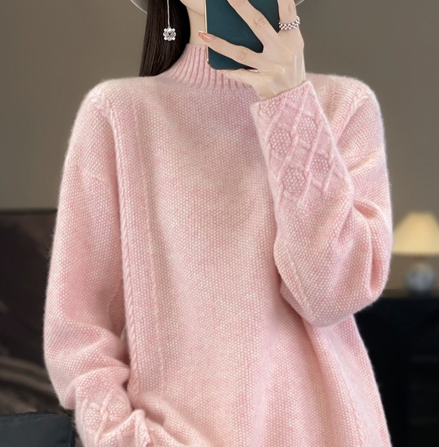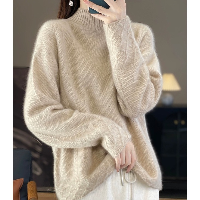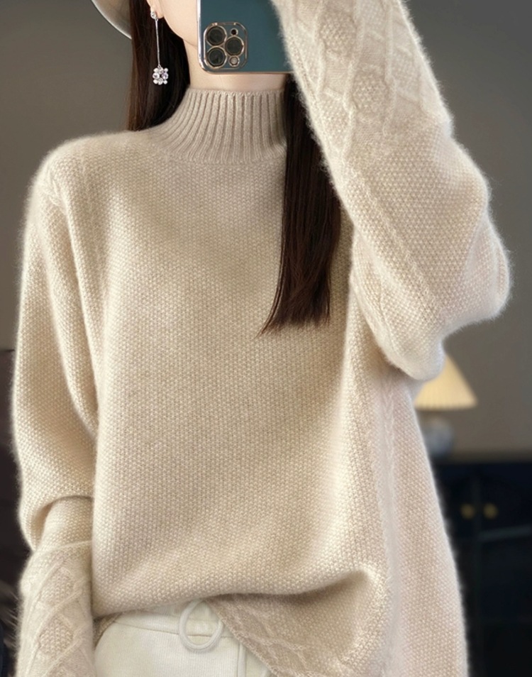 Retro Jacquard Knitted HalfHigh Neck Base Sweater Loose Effortless Base Top