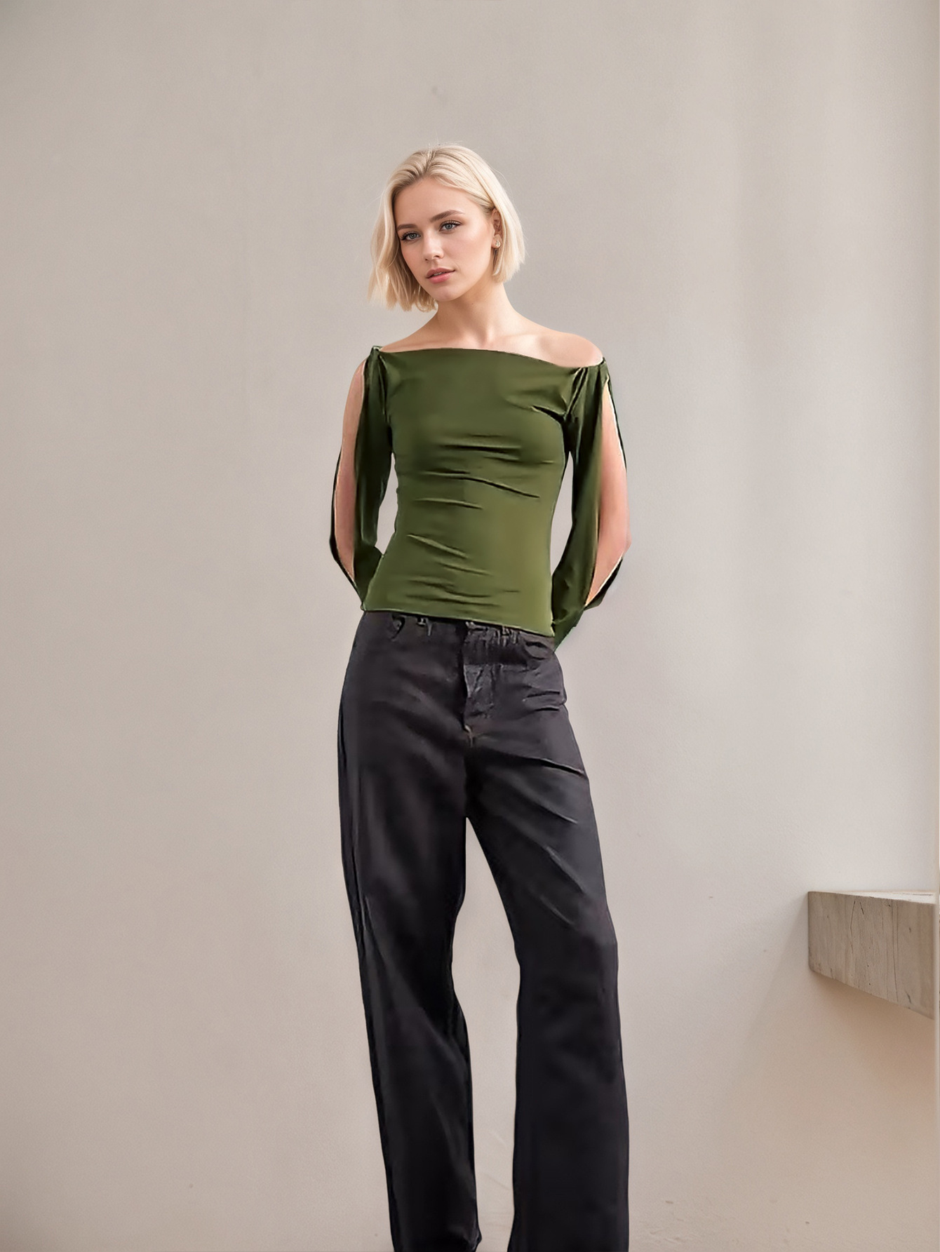 Women's Knit Top With A Boat Neckline Off-the-shoulder Design Long Sleeves Personalized Hollow-out Detailing And Twisted Cuff Accents For A Figure-hugging Fit