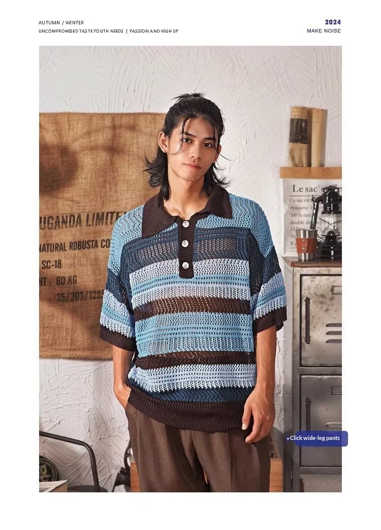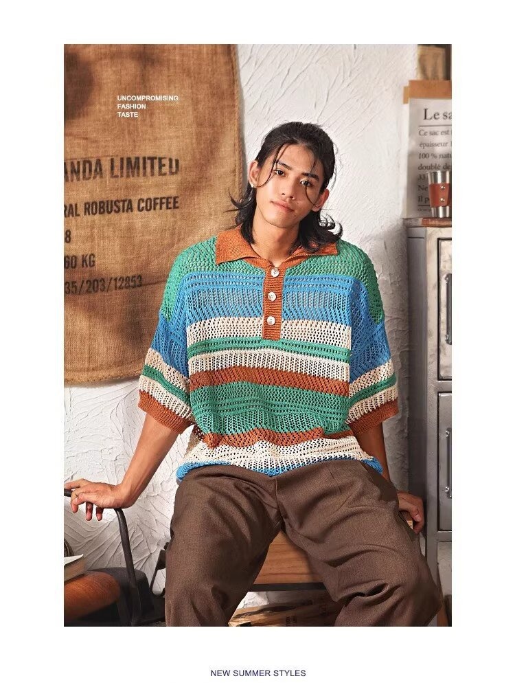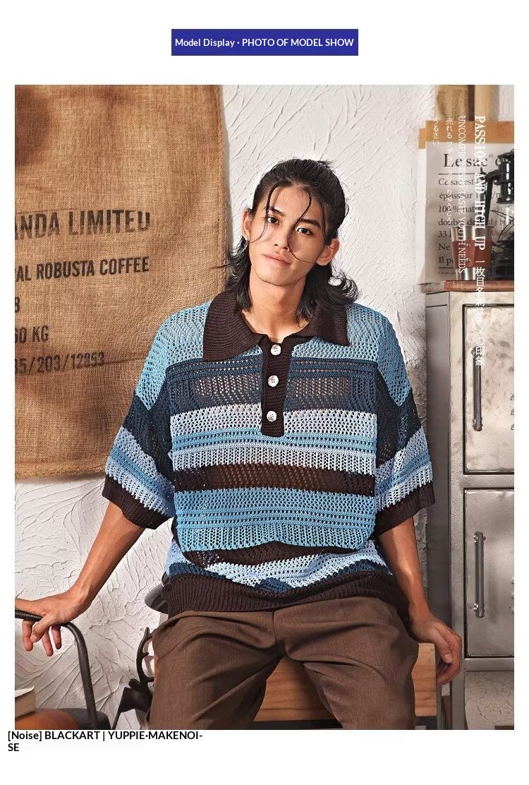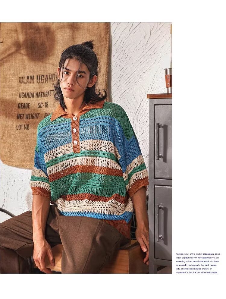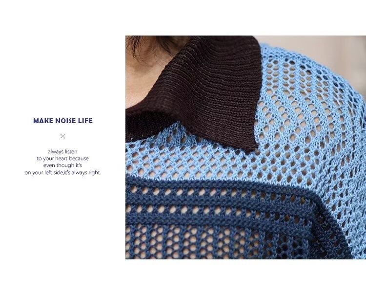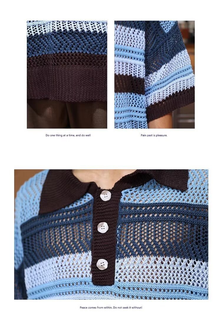 Color-block Striped Hollow-out Knit Retro Lapel T-shirt