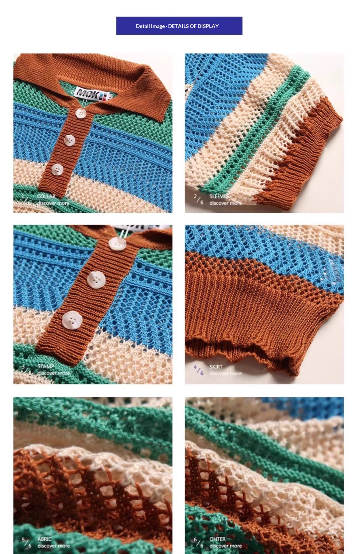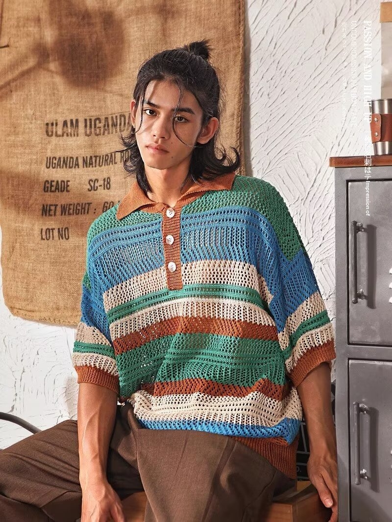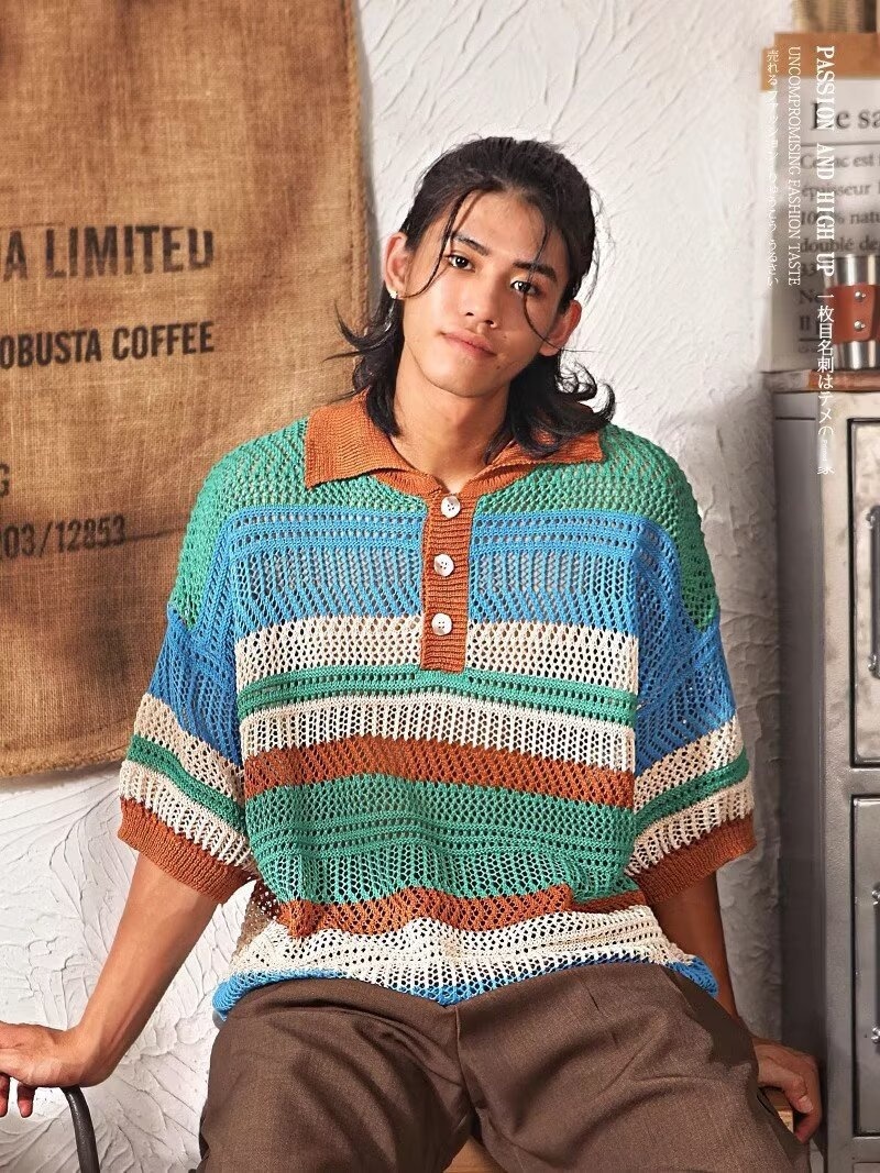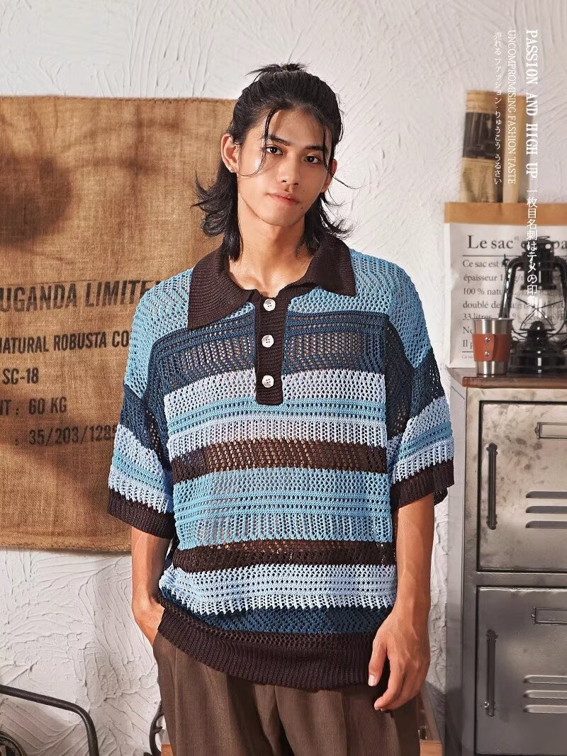 Color-block Striped Hollow-out Knit Retro Lapel T-shirt
