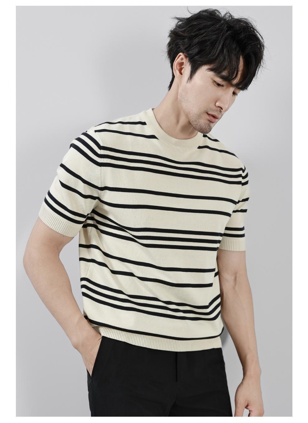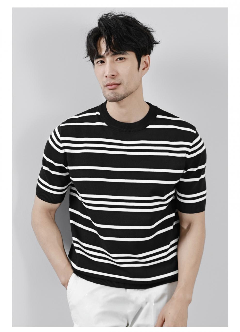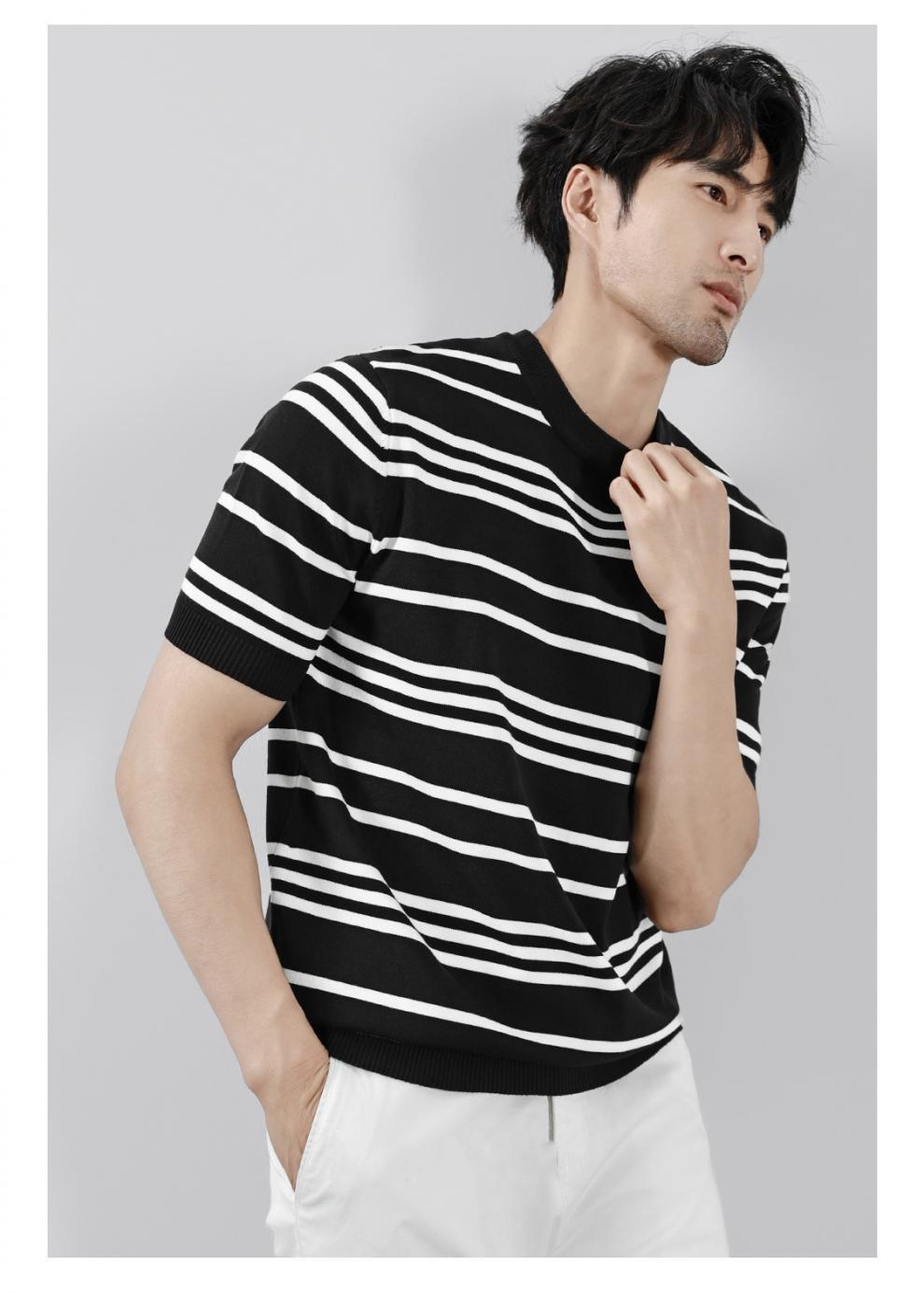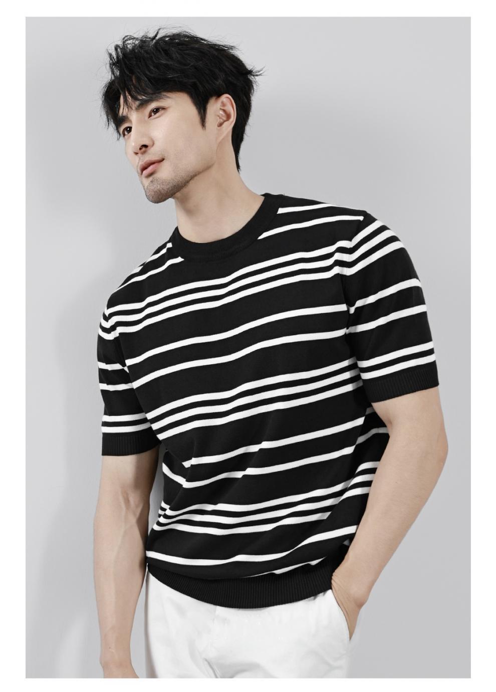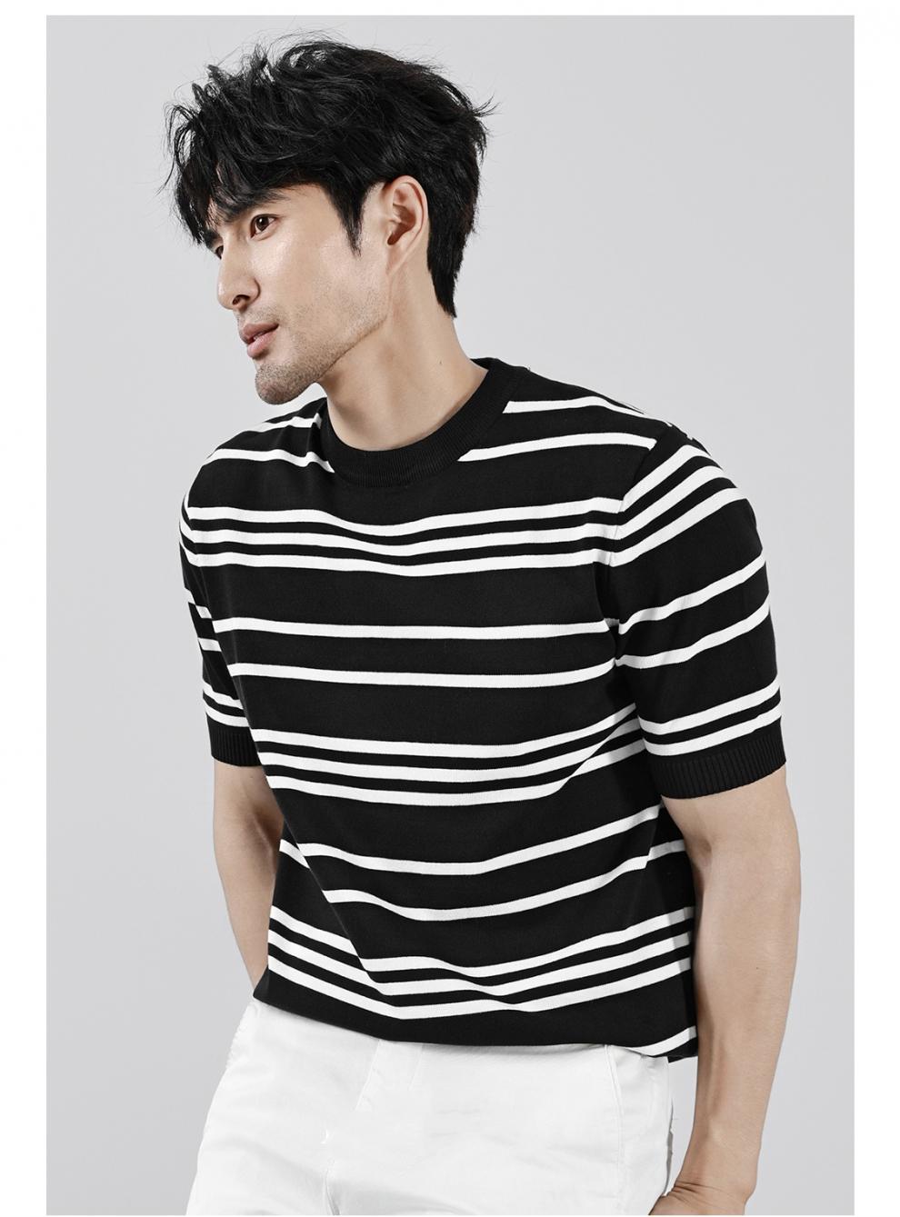 Knitted Ice Silk T-shirt Men's Short Sleeve Black And White Stripes