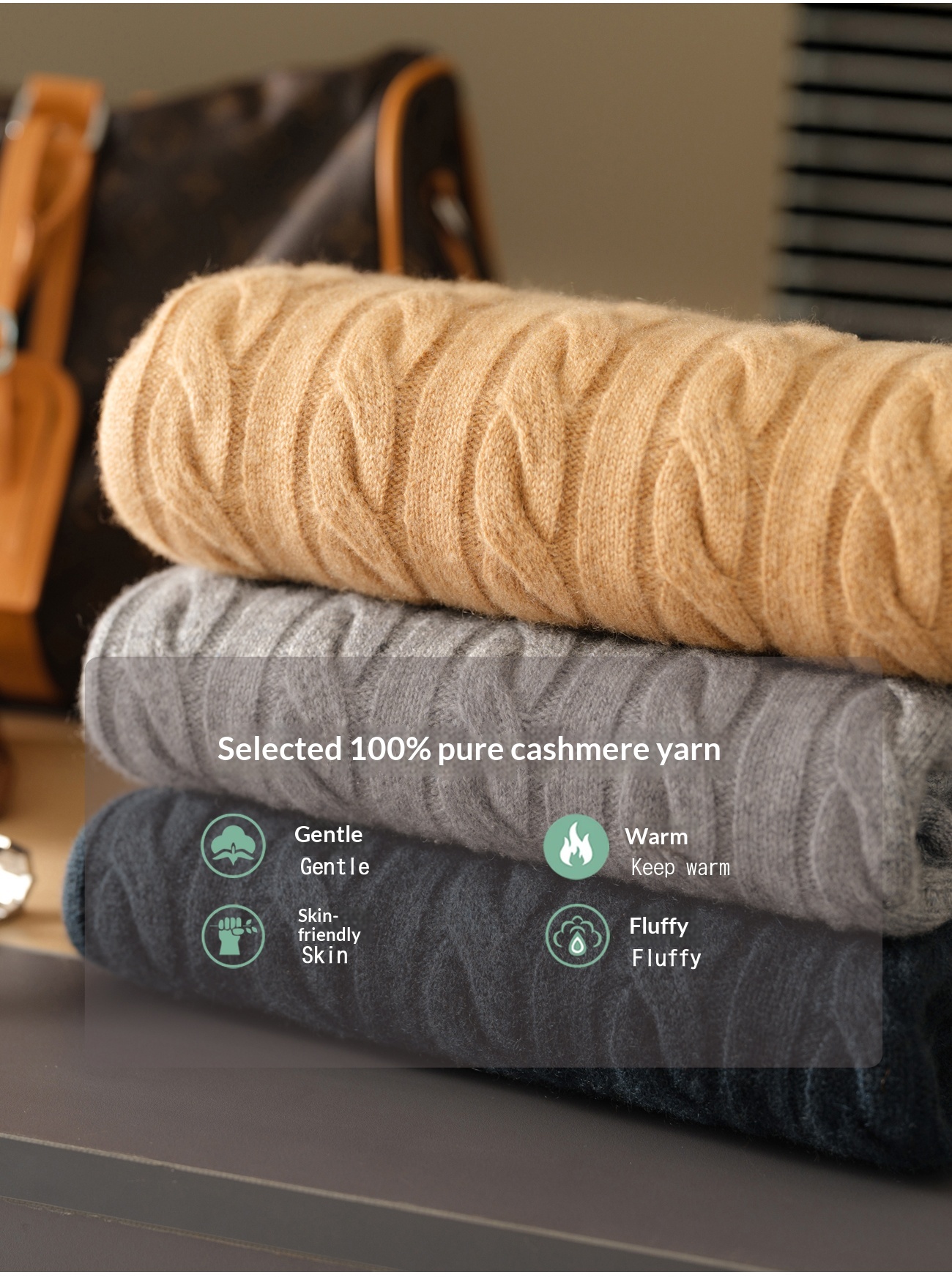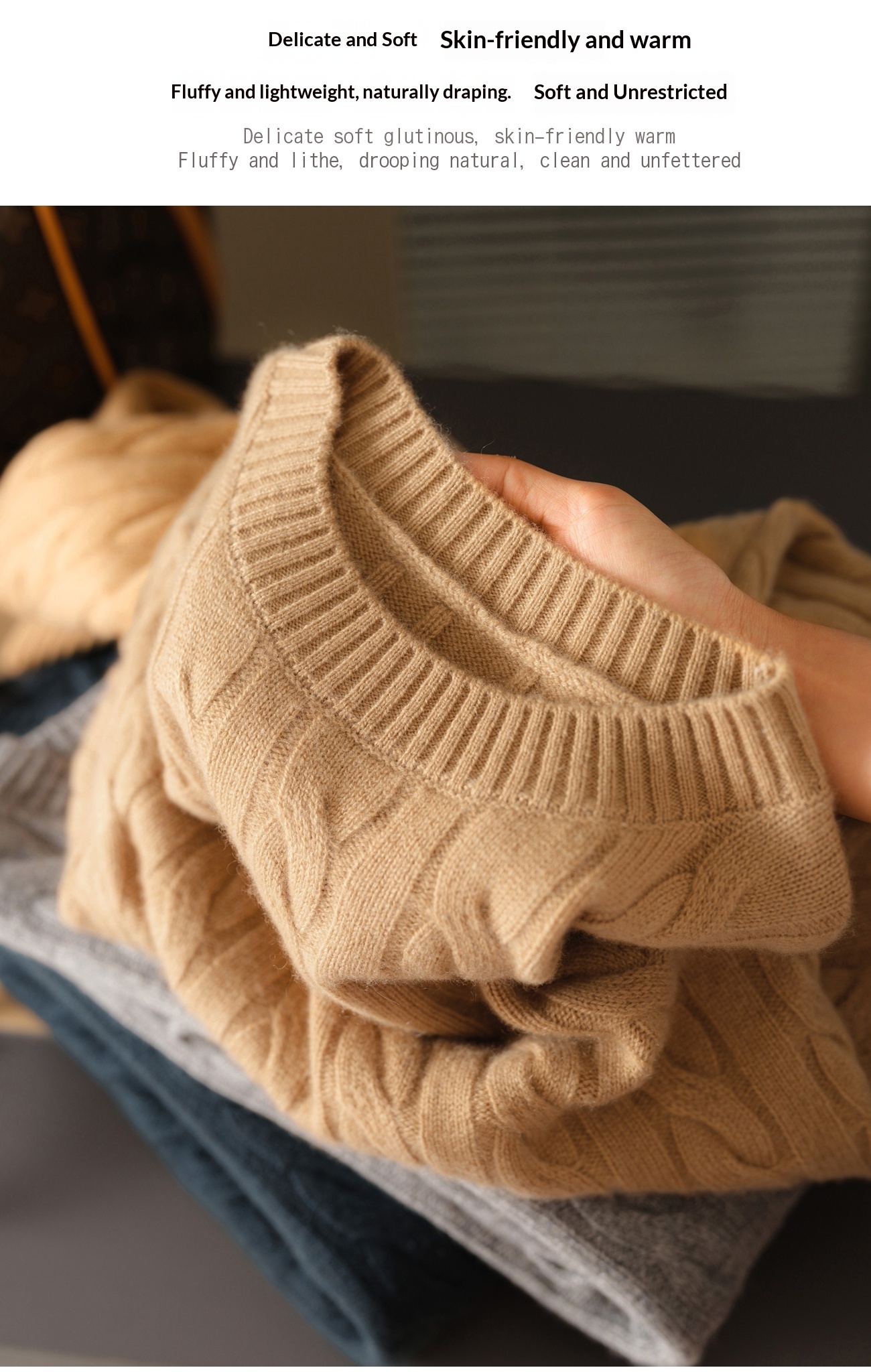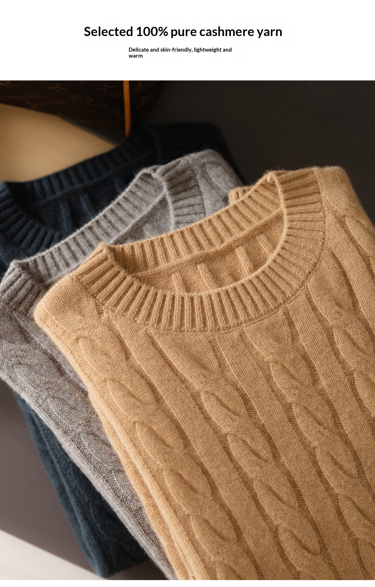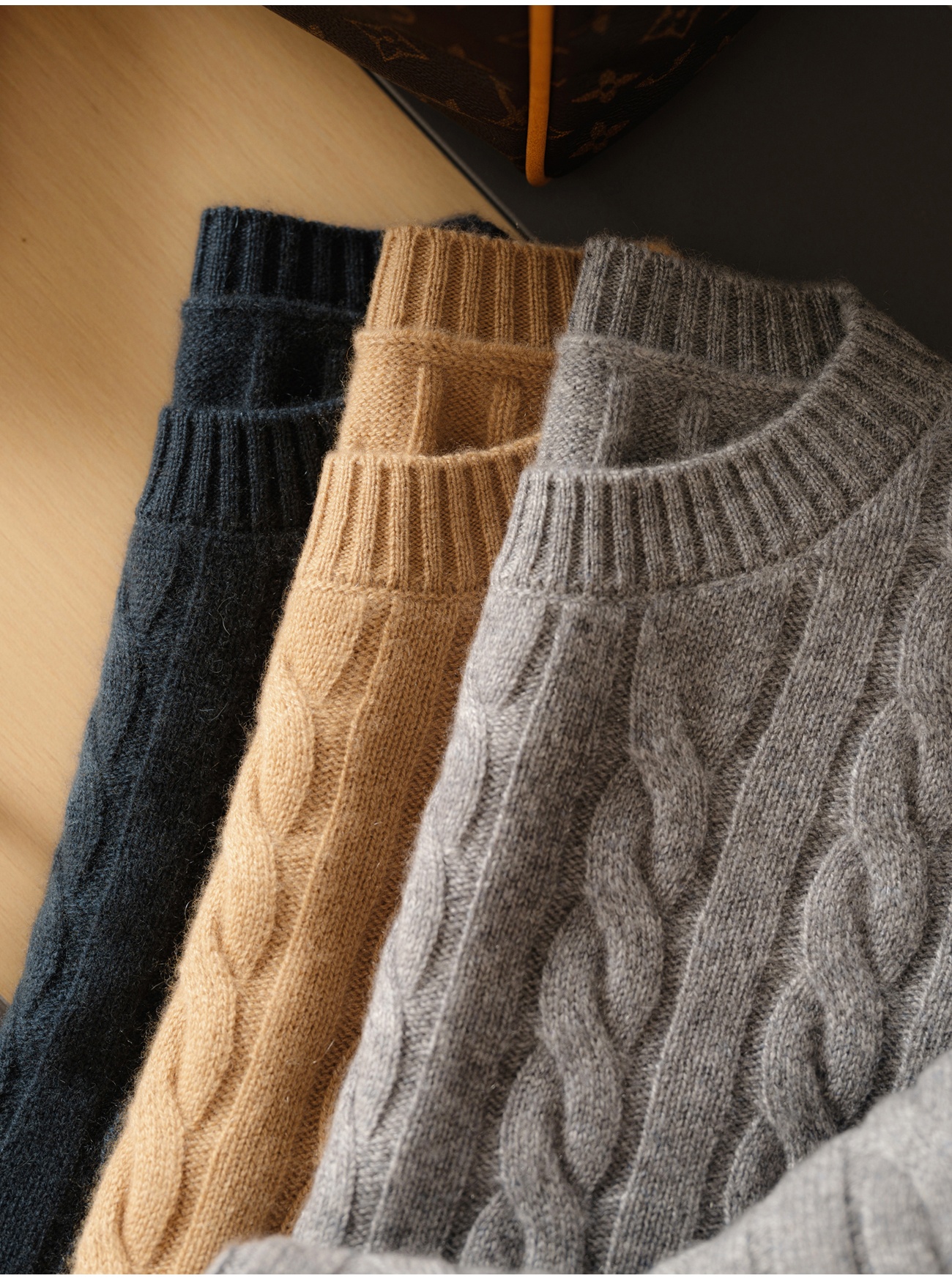 Pure Cashmere Sweater Round Neck Double-ply Cable Knit Thickened Warm Base Layer